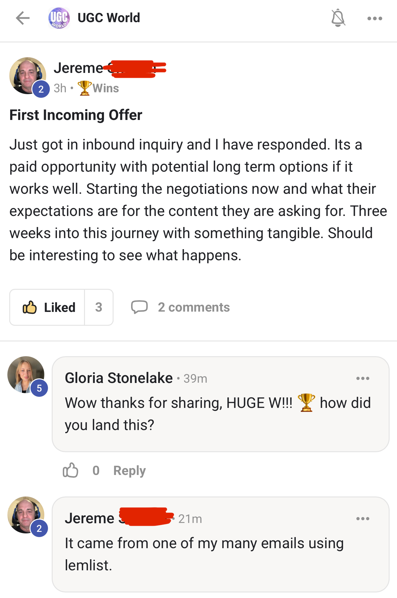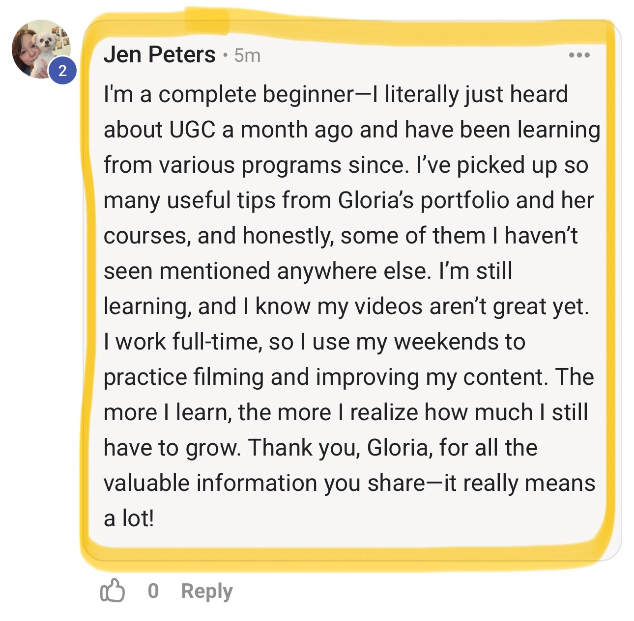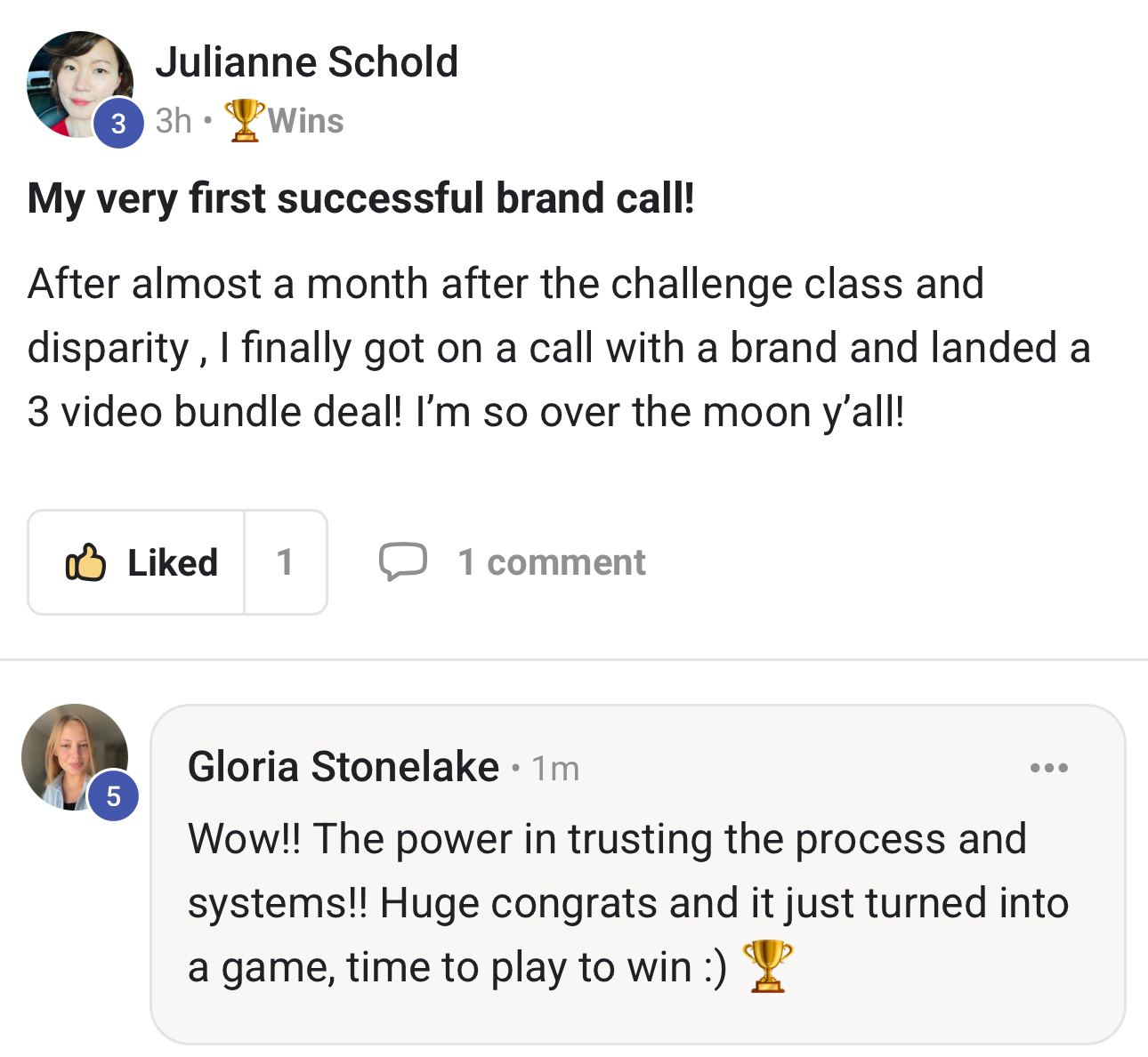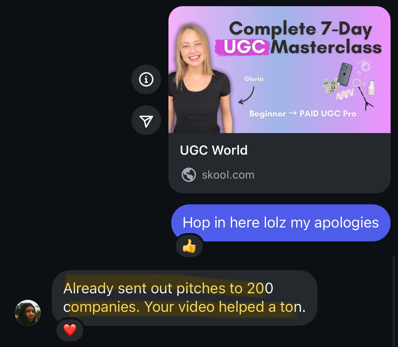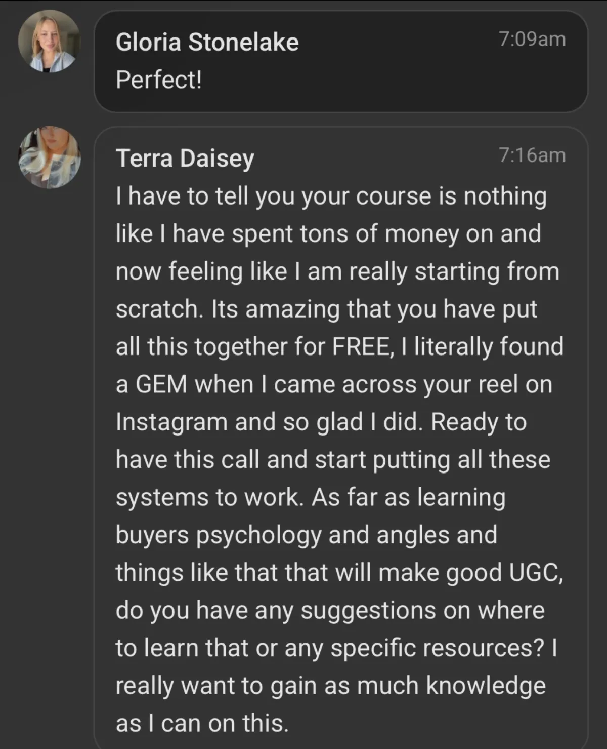 Bonus #4: Get instant access to an active community of likeminded UGC Creators. We have creators who are just starting out and creators already at 6 figures, looking to make multiple 6 figures. Never feel alone in your UGC Journey again. Your network is your net-worth.